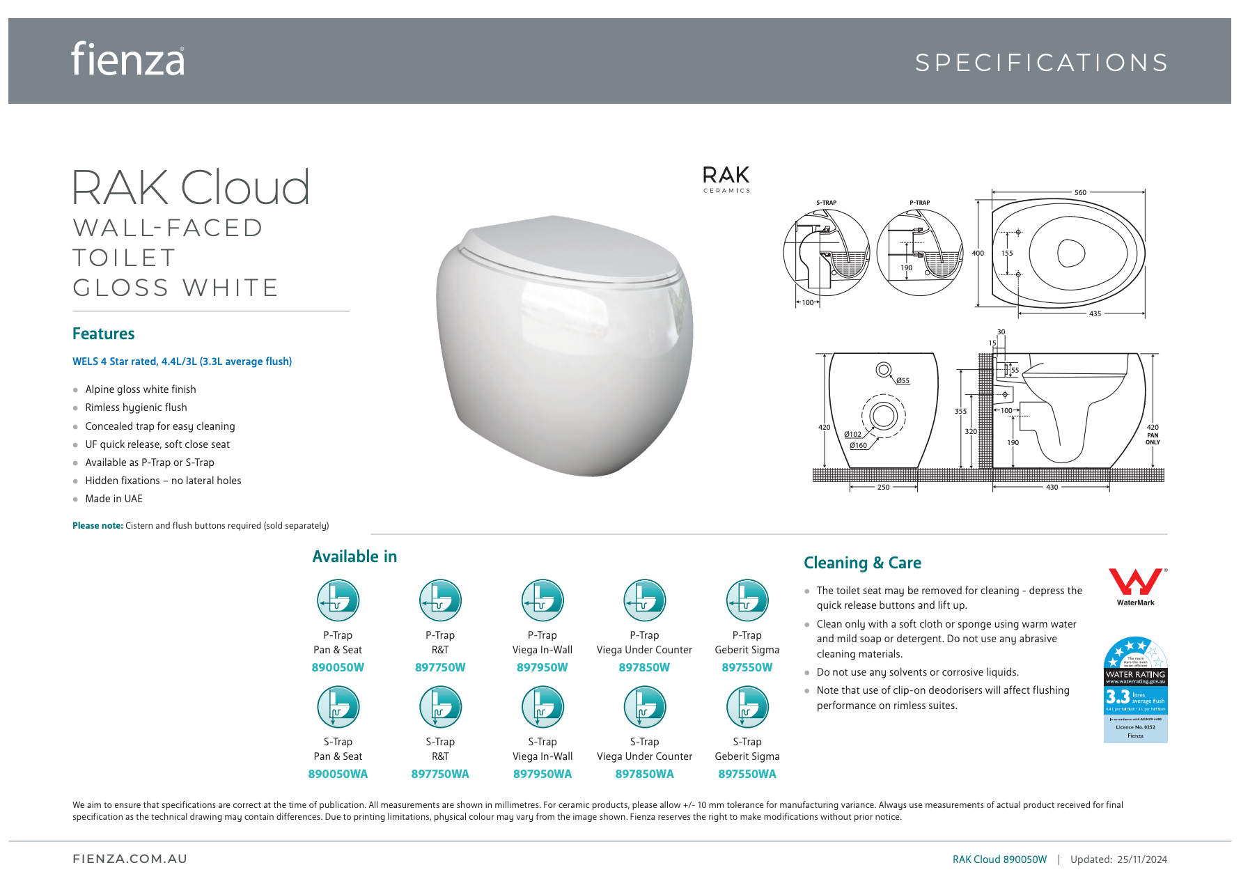 Fienza Rak Cloud Wall Faced Toilet Suite Alpine White Pan Only