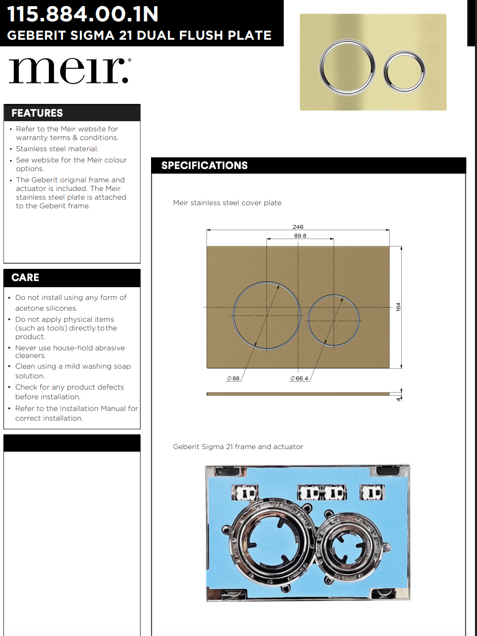 Incorporating Swiss engineering and luxury, and accented with Meir's designer finishes, these stylish dual flush plates represent intelligent and sophisticated design combined with superior functionality.