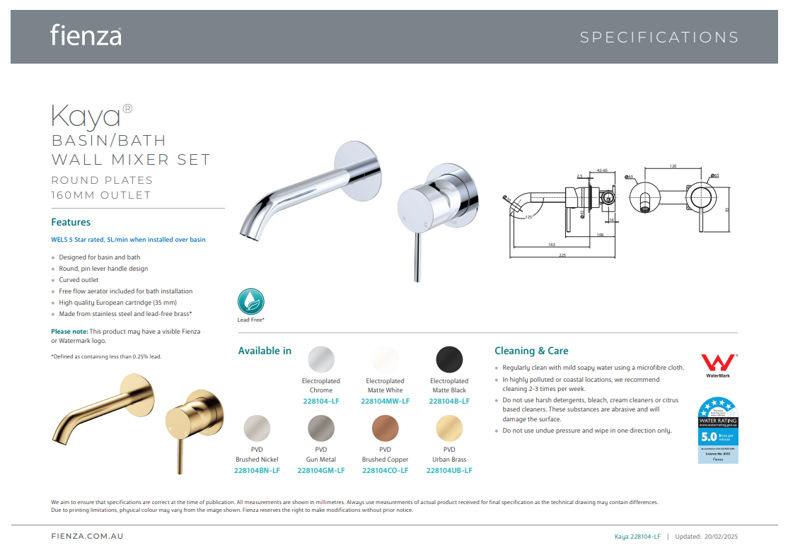 Make a bold statement in your bathroom with the Fienza Wall Basin/Bath Mixer Set in Matte Black. With its sleek, modern finish, this set adds depth and sophistication to any bathroom space. Designed for both basins and baths, it combines practical functionality with an effortlessly stylish edge.