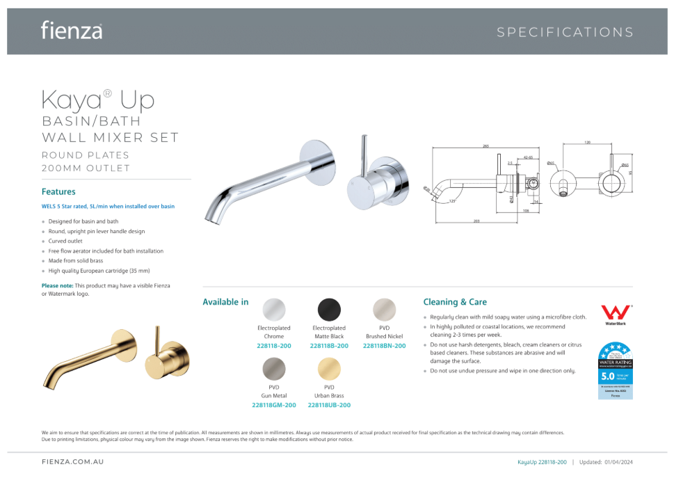 Kaya Up Wall Basin/Bath Mixer Set 200mm