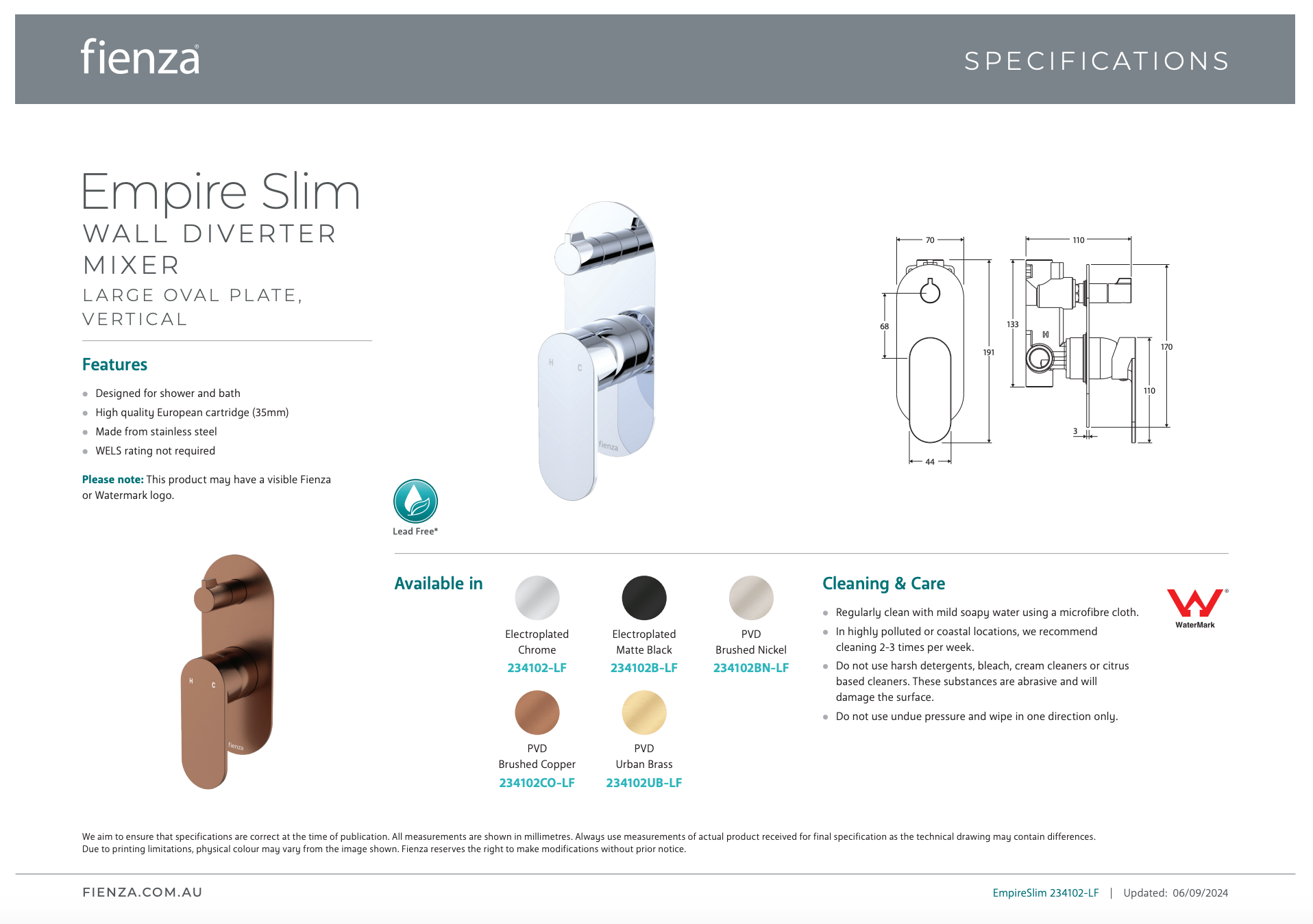 The Fienza Empire Slim Shower Mixer with Diverter & Backplate is the perfect blend of sleek design and everyday practicality. Part of the modern Empire Slim collection, this mixer features a slimline lever and a polished chrome finish that elevates any contemporary bathroom.