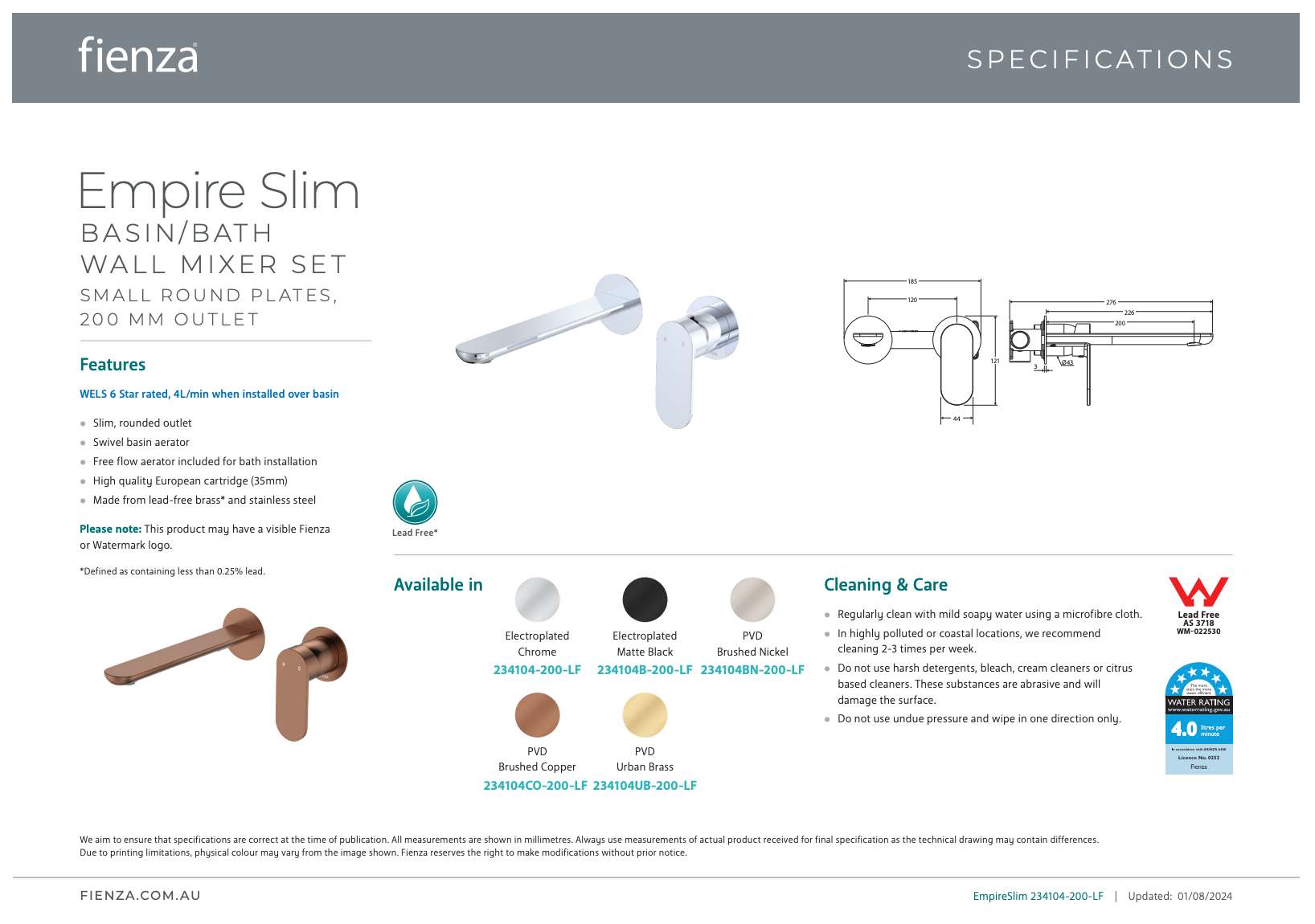Engineered from high-quality materials and backed by Fienza’s lifetime warranty, the Empire Slim range ensures durability, performance, and peace of mind for years to come. Suitable for both basins and baths, this versatile wall mixer combines streamlined aesthetics with functional precision.