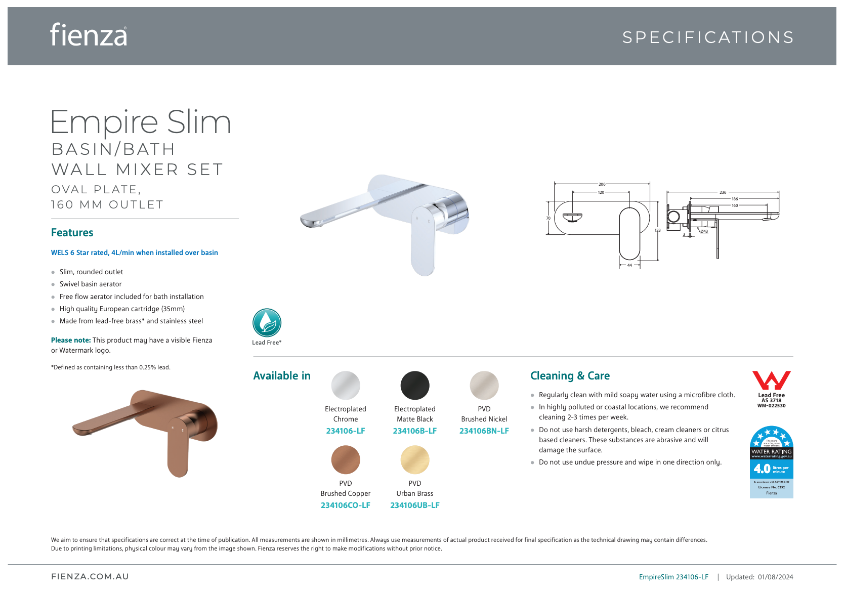 Fienza Empire Slim Wall Basin/Bath Mixer Set Oval Plate 160mm Matte Black