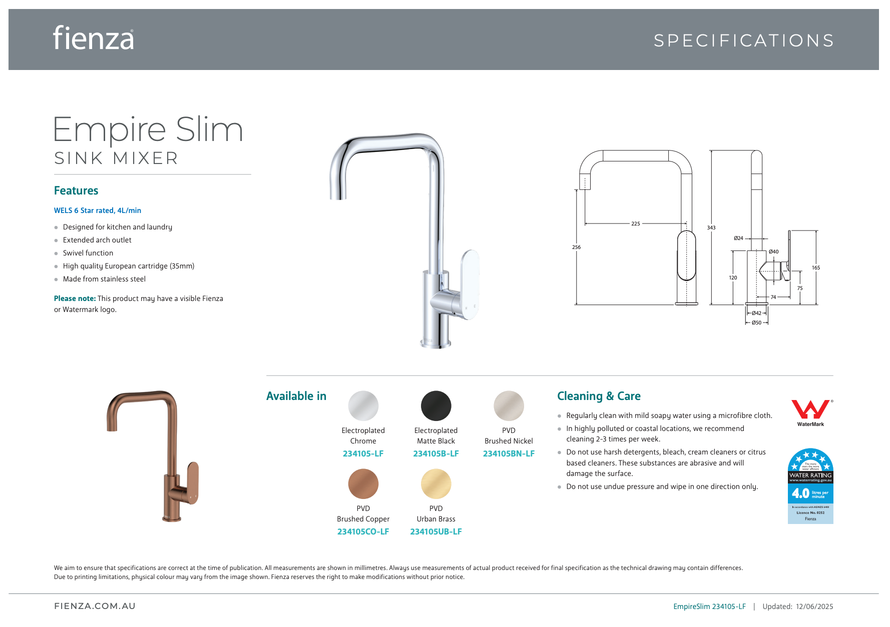 Crafted from premium materials and backed by Fienza’s lifetime warranty, the Empire Slim range is built to deliver both performance and peace of mind. Its single-lever handle ensures effortless control over water temperature and flow, combining style with practicality for everyday living.