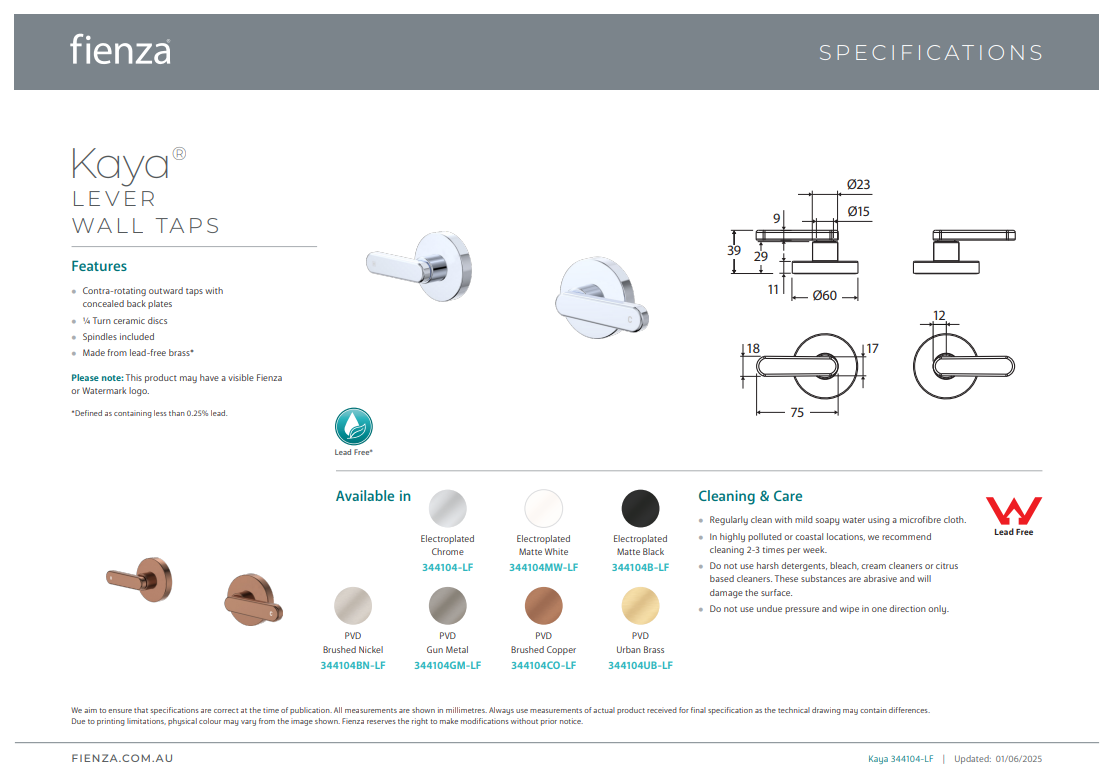 Fienza Kaya Lever Wall Taps, Chrome