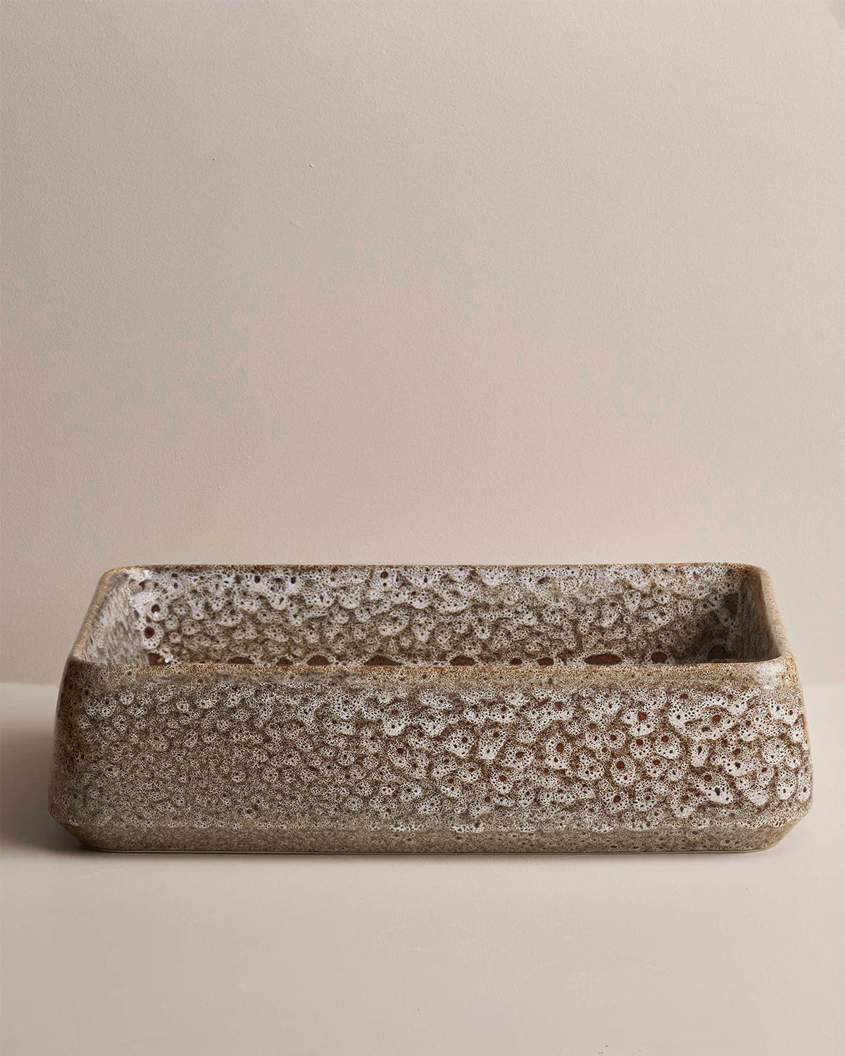 A simple rectangular form with a modern profile. The largest of our basins, Kiln 515 is a statement piece. Designed and handmade in Australia, this custom piece is available in 6 different reactive glaze finishes. Each original basin will vary slightly from the images shown.