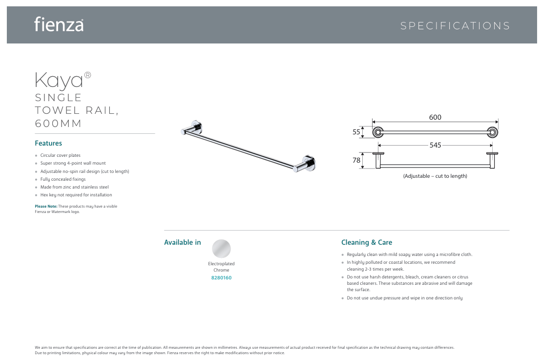 Fienza Kaya Single Towel Rail, 600mm, Chrome