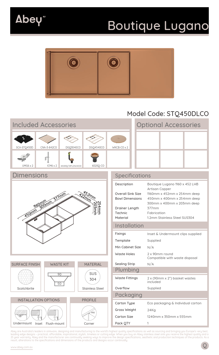 Abey Boutique Lugano One & One Quarter Drainer Left Hand Bowl Artisan Copper