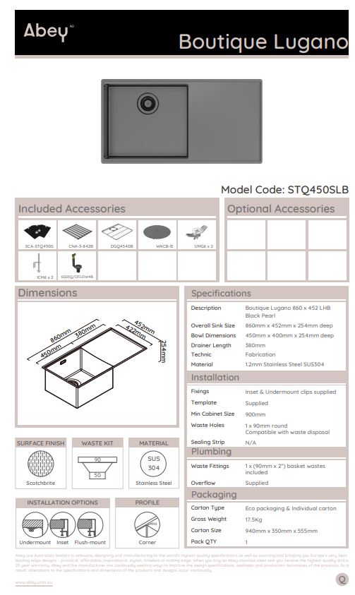 Abey Boutique Lugano Single Bowl & Drainer Left Hand Bowl Black Pearl