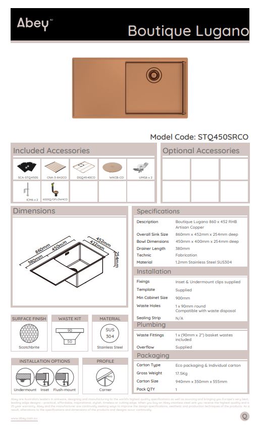 Abey Boutique Lugano Single Bowl & Drainer Right Hand Bowl Artisan Copper