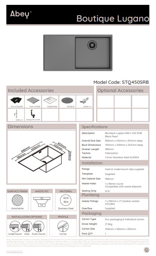 Abey Boutique Lugano Single Bowl & Drainer Right Hand Bowl Black Pearl