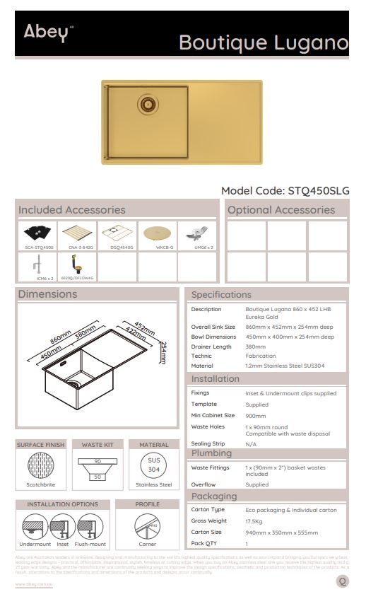 Abey Boutique Lugano Single Bowl & Drainer Left Hand Bowl Eureka Gold