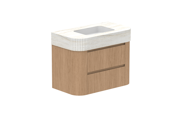 Imperial: Moulded top with fluted edge detailing, fabricated from Durasein Solid Surface. Integrated matte white basin with overflow, positioned in the front of the bowl. 0 tap hole only, can be drilled onsite. Available in Blossoming & Sakal Durasein only.