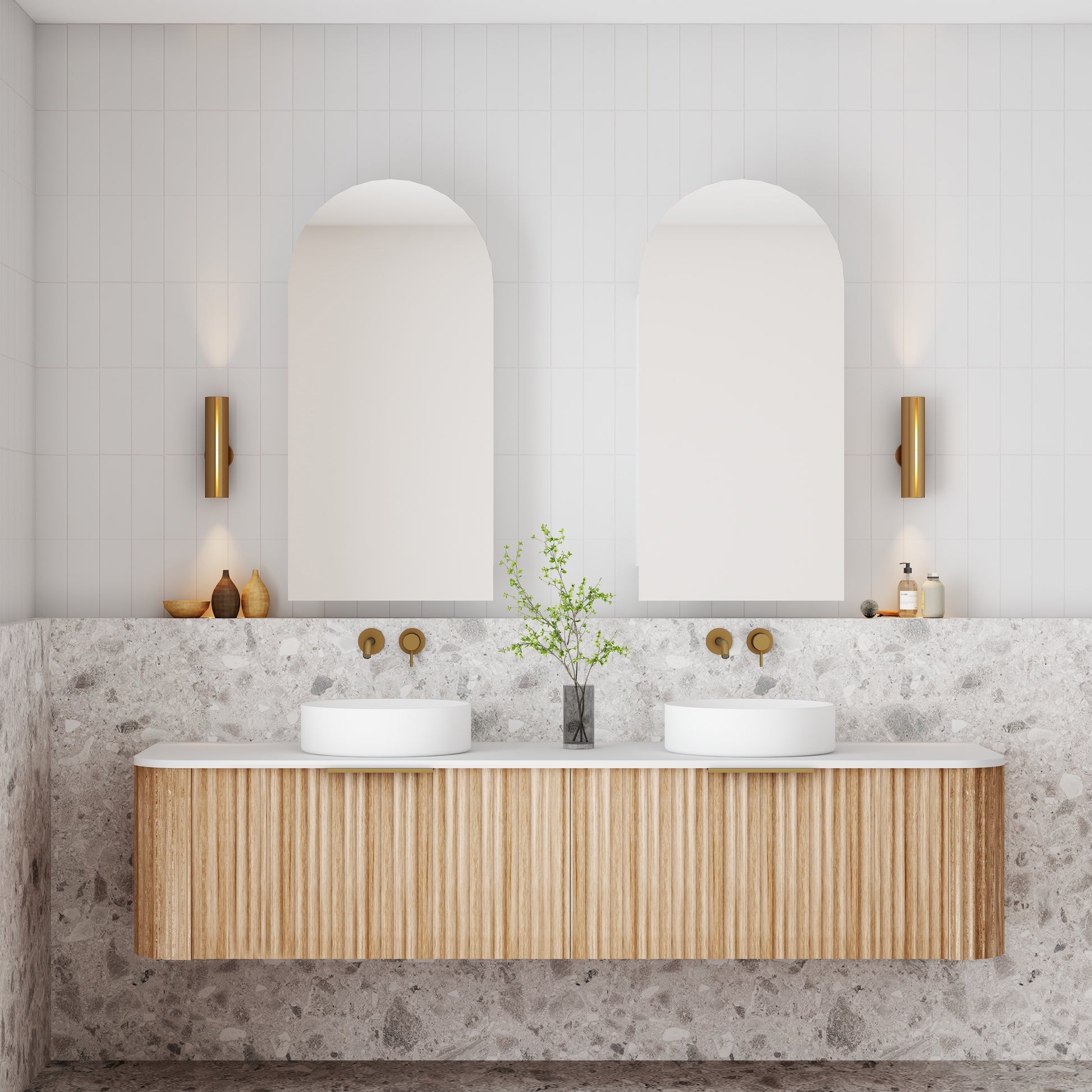 - Cassa Design Created a point of focus with the uniquely shaped shaving cabinet.