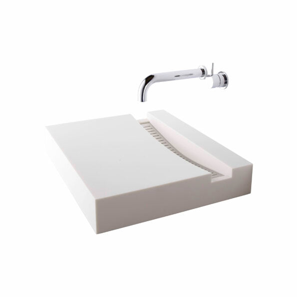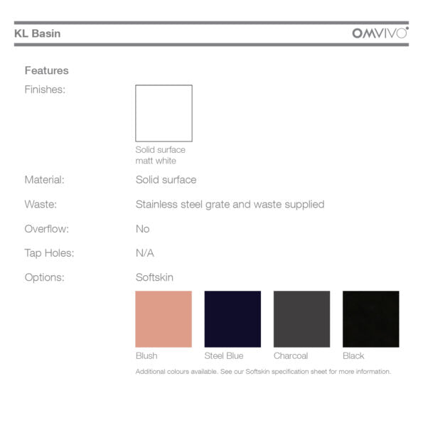 Manufactured from solid surface it has a smooth matt finish that is durable and easy to maintain which is ideal for residential and commercial applications. It is also available with softskin options giving your basin a beautiful two tone effect.