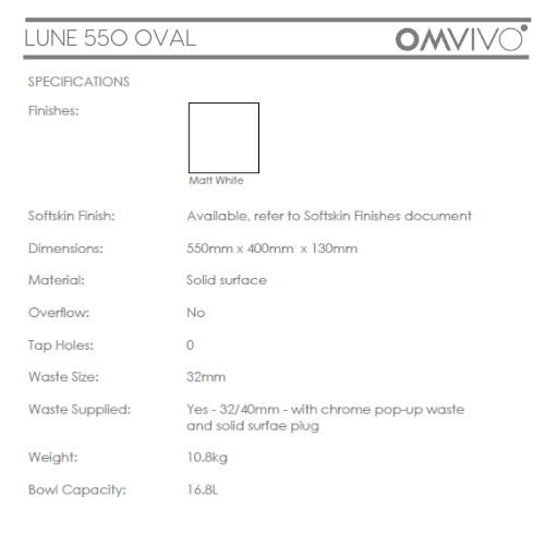 The Lune 550 oval basin features a high volume and is designed to be bench mounted. Lune basins are supplied with a pop up waste with and matching solid surface plug.
