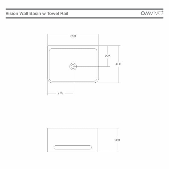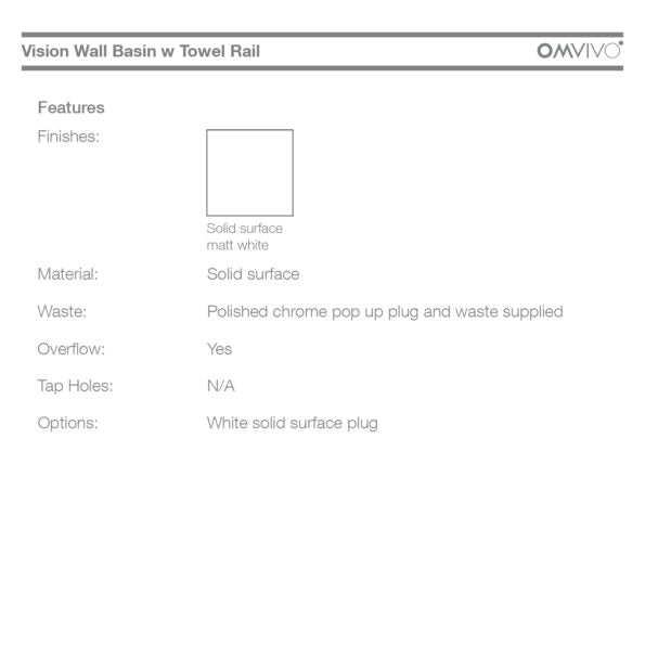 Vision basins are supplied with a chrome pop up waste and the wall mounted basins are provided with white powdercoated steel wall brackets. A White matching solid surface plug is also available.