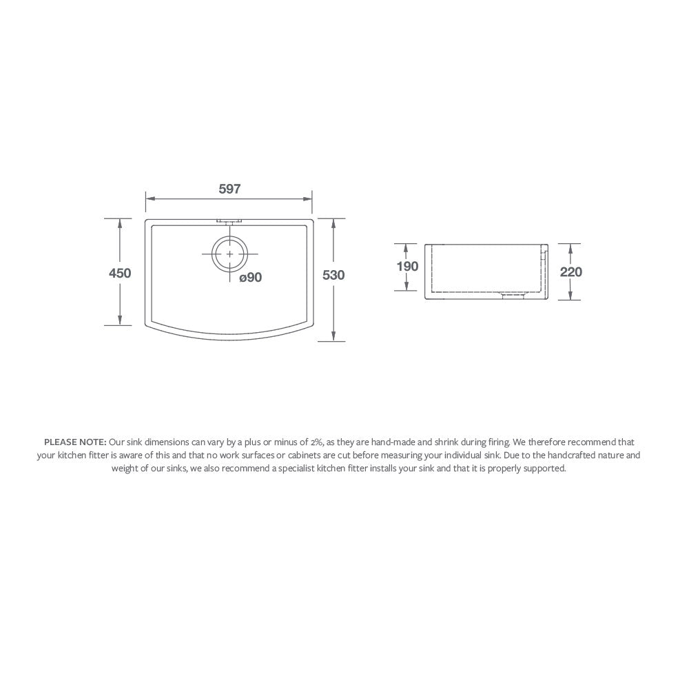All dimensions are in mm. Dimensions may vary by up to plus or minus 2%; we recommend that customers do not cut out work surfaces or units until they have taken delivery of their sink. Because all our fireclay sinks are handmade using traditional methods, they are 100% unique. Slight variations in the finish from one sink to the next add character and are in keeping with the way these sinks have been made for the past 100 years.
