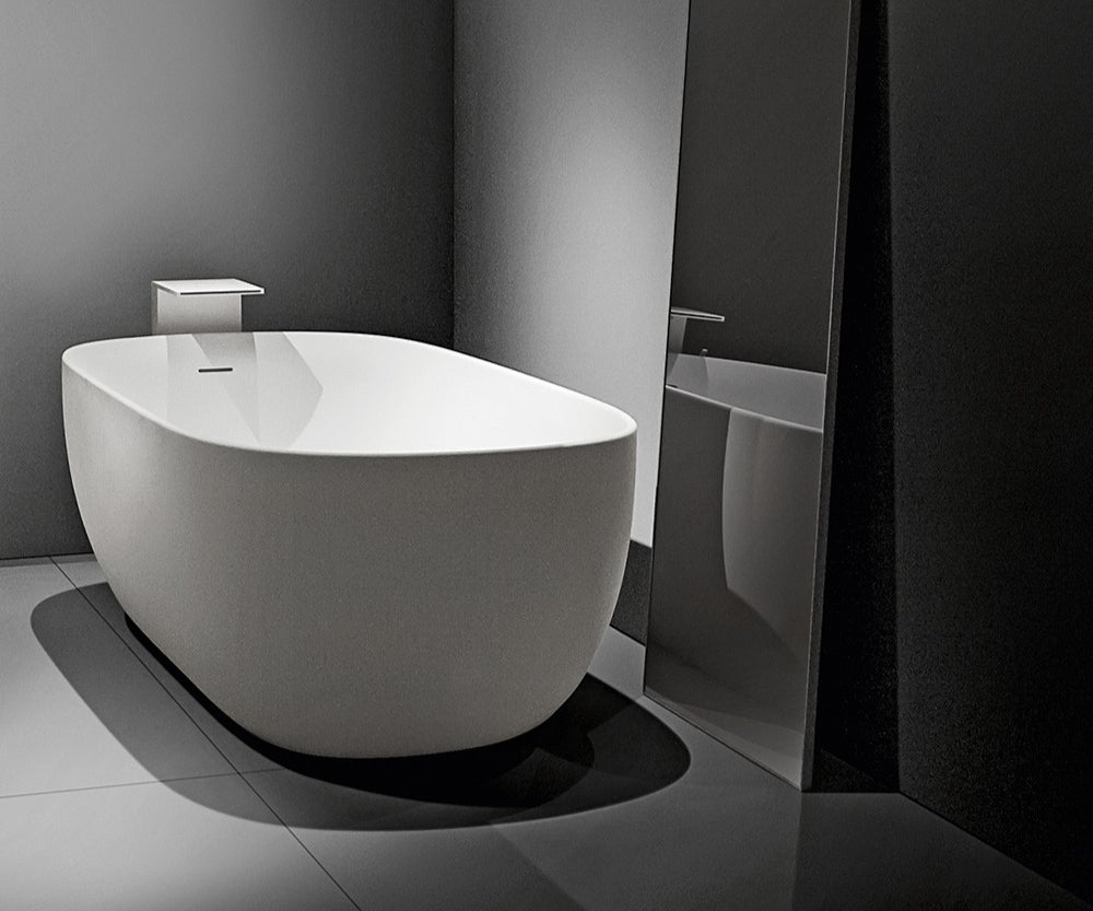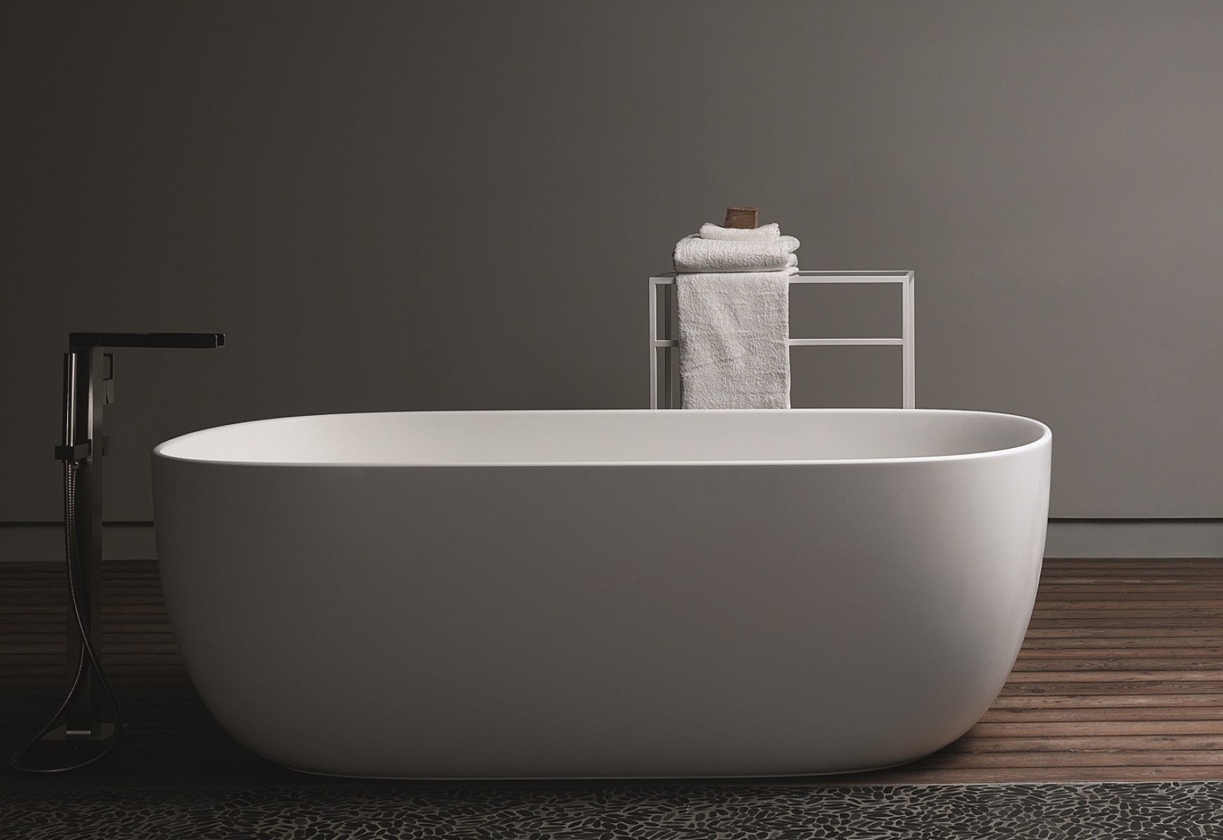 The Fiume freestaning bath features a modern yet organic design, characterized by its smooth, proportional curves that create a sense of natural harmony. The wide, oval shape is both aesthetically pleasing and functional, providing ample space to accommodate anyone comfortably.