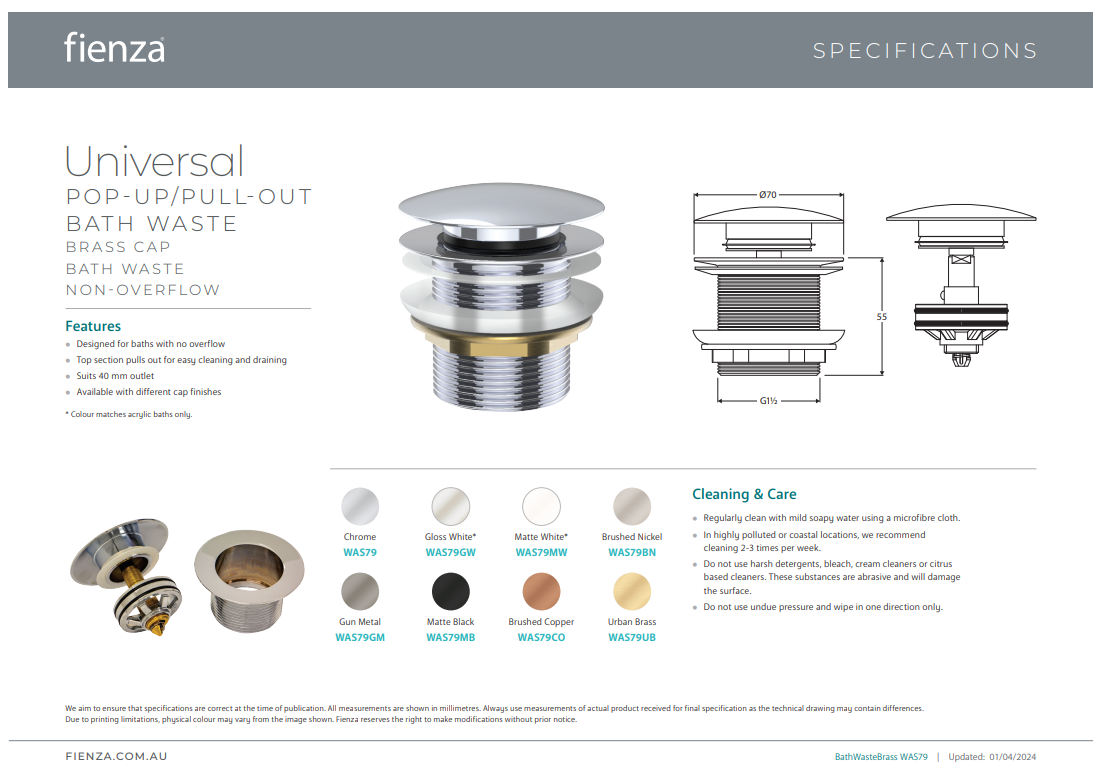 Fienza Universal Pull-Out/Pop-Up NO Overflow Gloss White