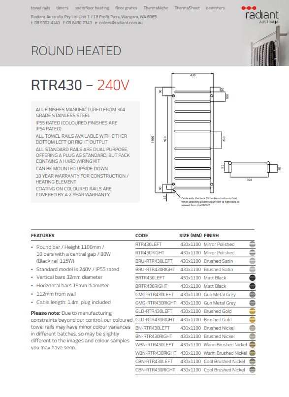 240V Heated Round Towel Ladder 430mm x 1100mm Mirror Polished