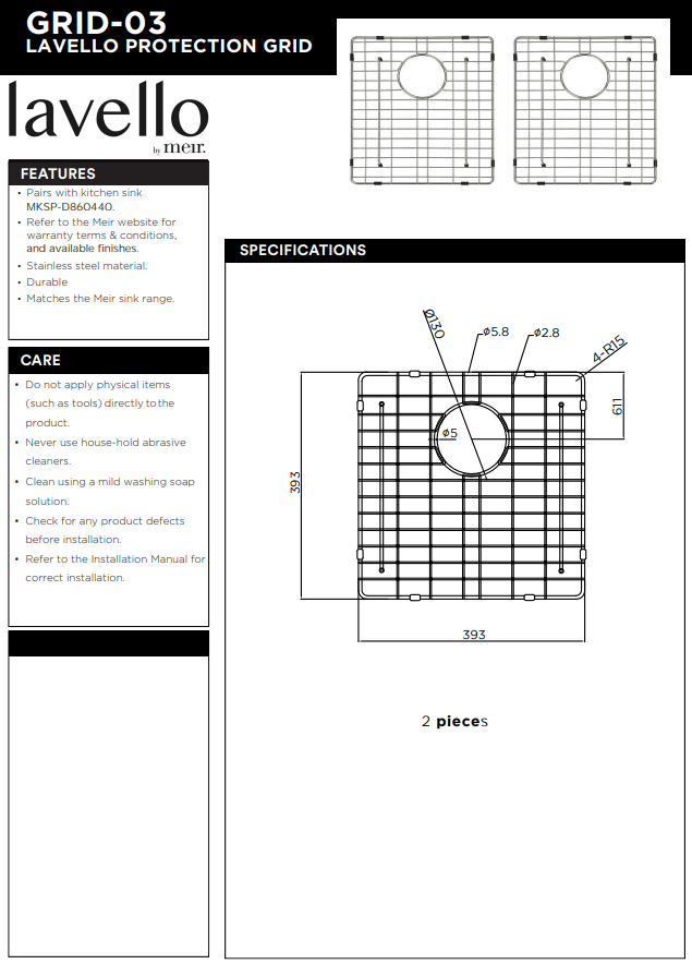 The Lavello Protection Grid takes care of your kitchen sinks and dries your dishes at the same time. Simply place this bottom grid at the base of your Lavello sink to protect it from sharp force or impacts. The grid can also be used as a drip tray for fruits and vegetables and defrosting frozen goods to keep your counter tops dry and clutter-free. Designed specifically to fit our Lavello kitchen sinks.