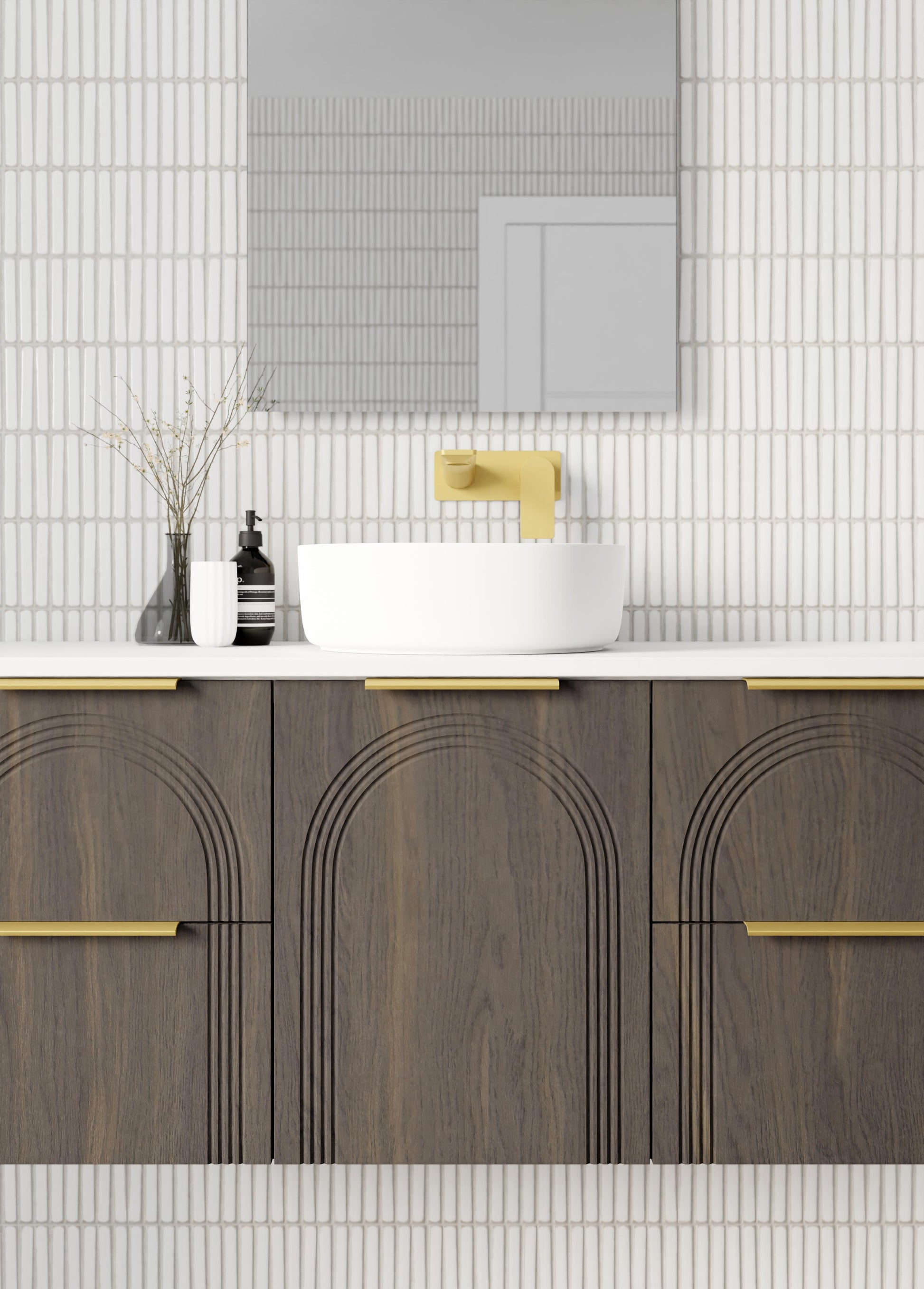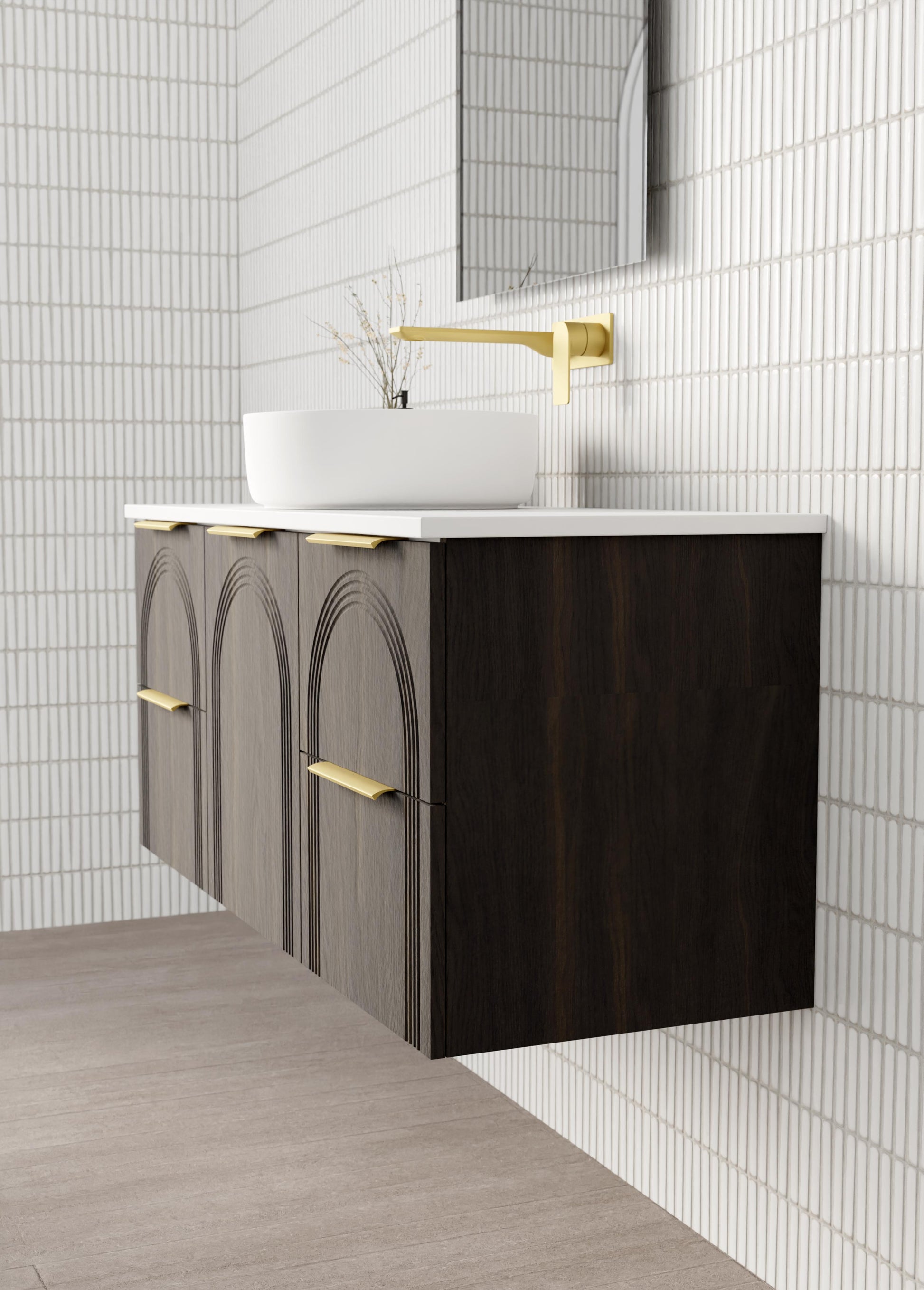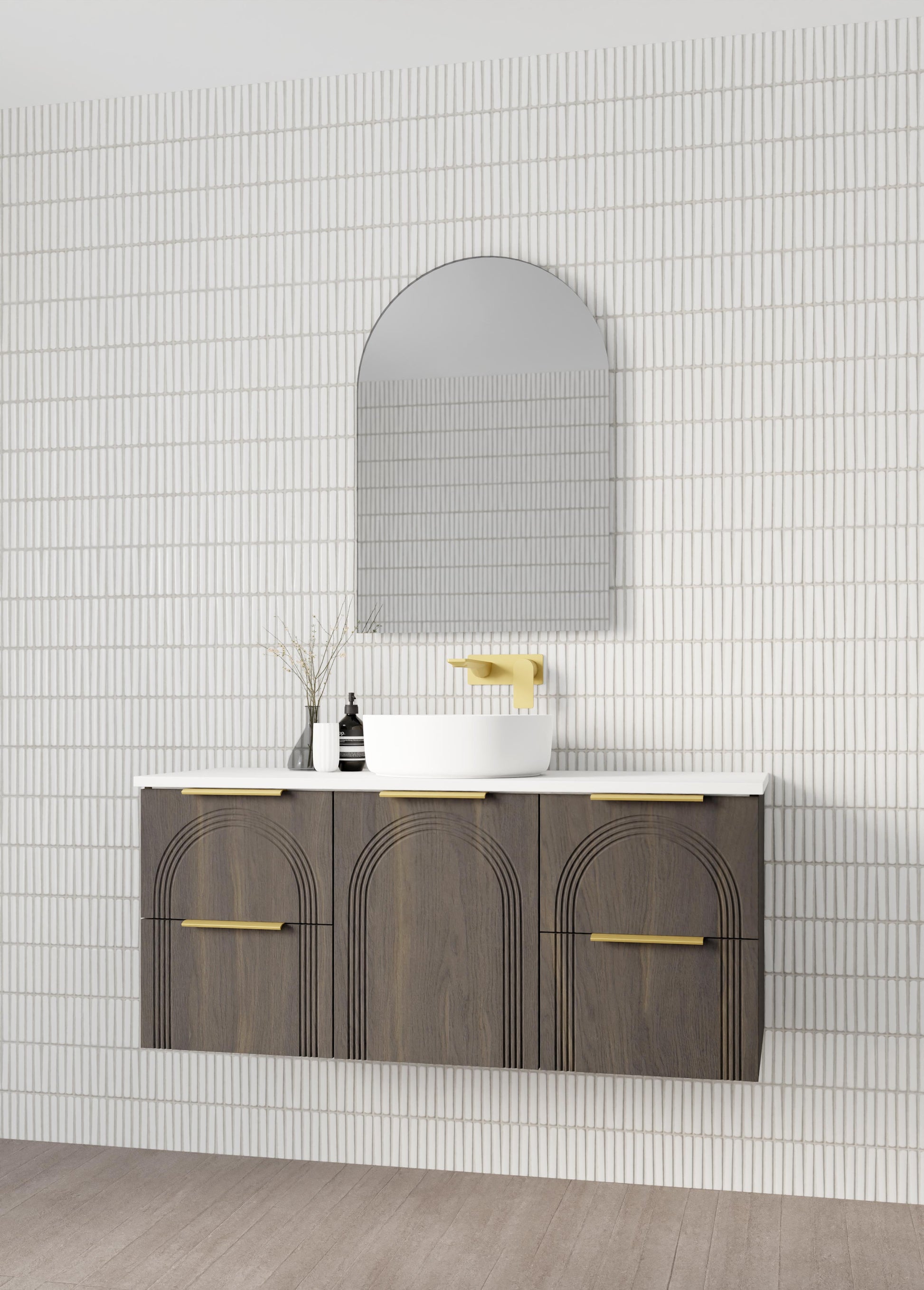 This wall-hung, drawer and door cabinet features thermolaminated V-groove arch detailed fronts available in 12 contemporary finishes. The doors and drawers are soft-close, to provide a sophisticated touch. The Arco vanity is designed to complement our Arco mirror, creating a stunning bathroom ensemble.