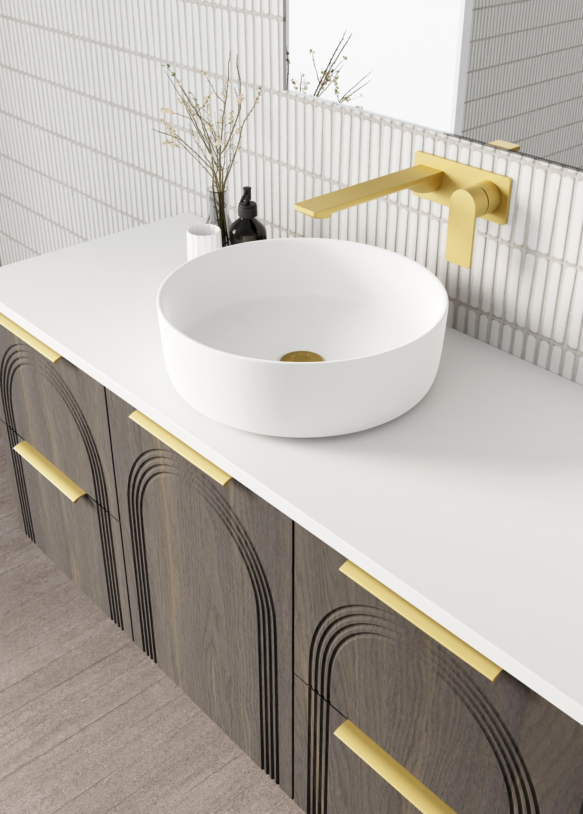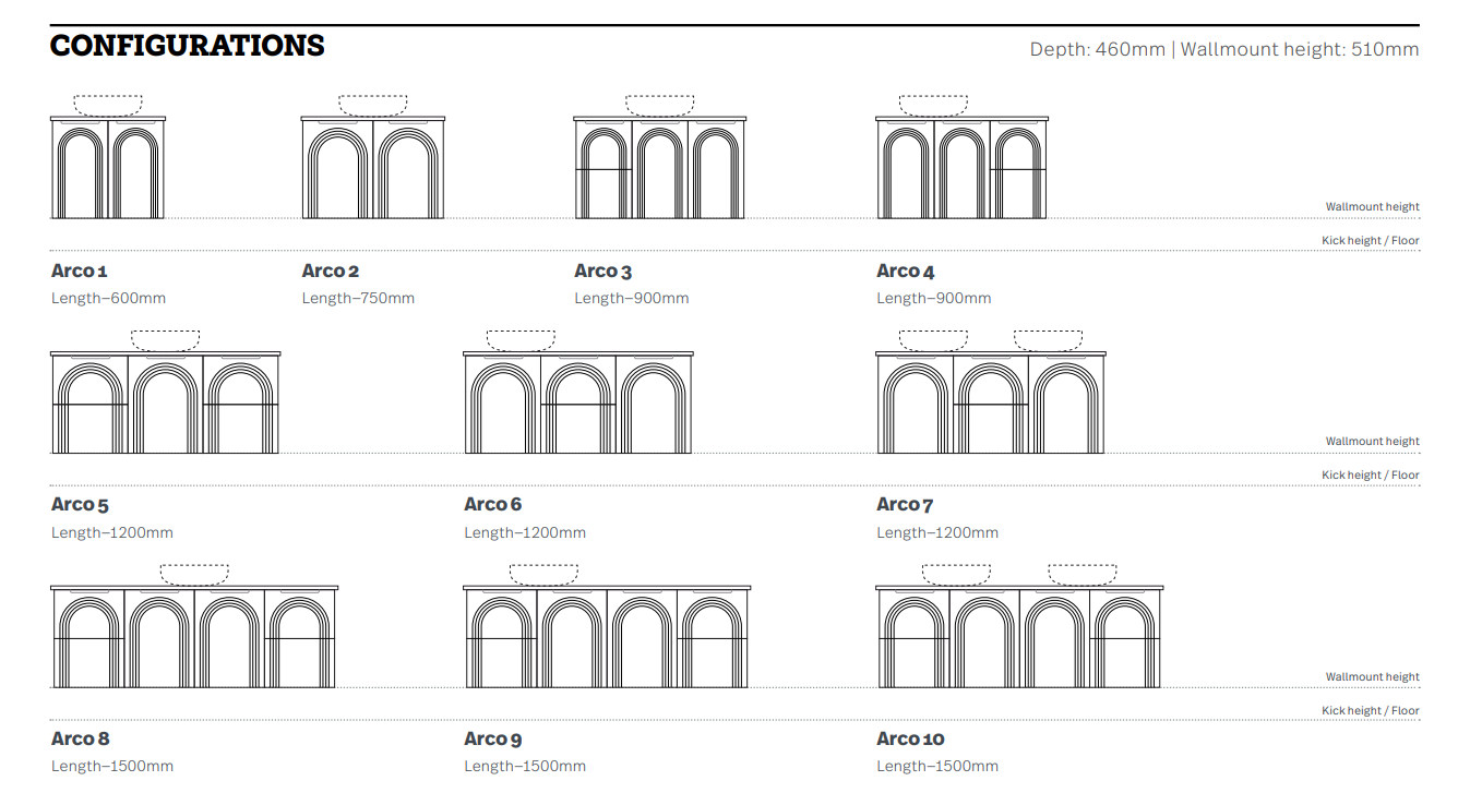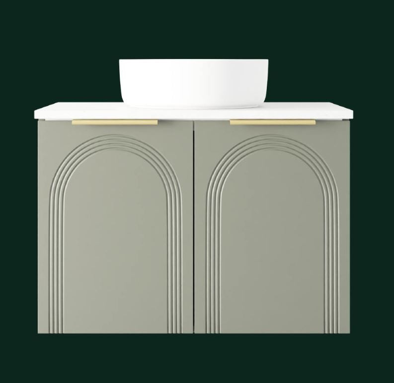 This wall-hung, drawer and door cabinet features thermolaminated V-groove arch detailed fronts available in 12 contemporary finishes. The doors and drawers are soft-close, to provide a sophisticated touch. The Arco vanity is designed to complement our Arco mirror, creating a stunning bathroom ensemble.