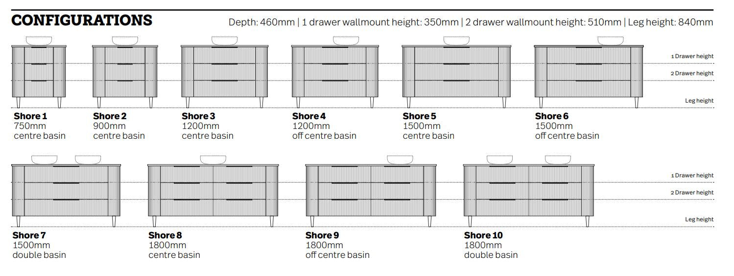 Depth: 460mm | 1 drawer wallmount height: 350mm | 2 drawer wallmount height: 510mm | Leg height: 840m