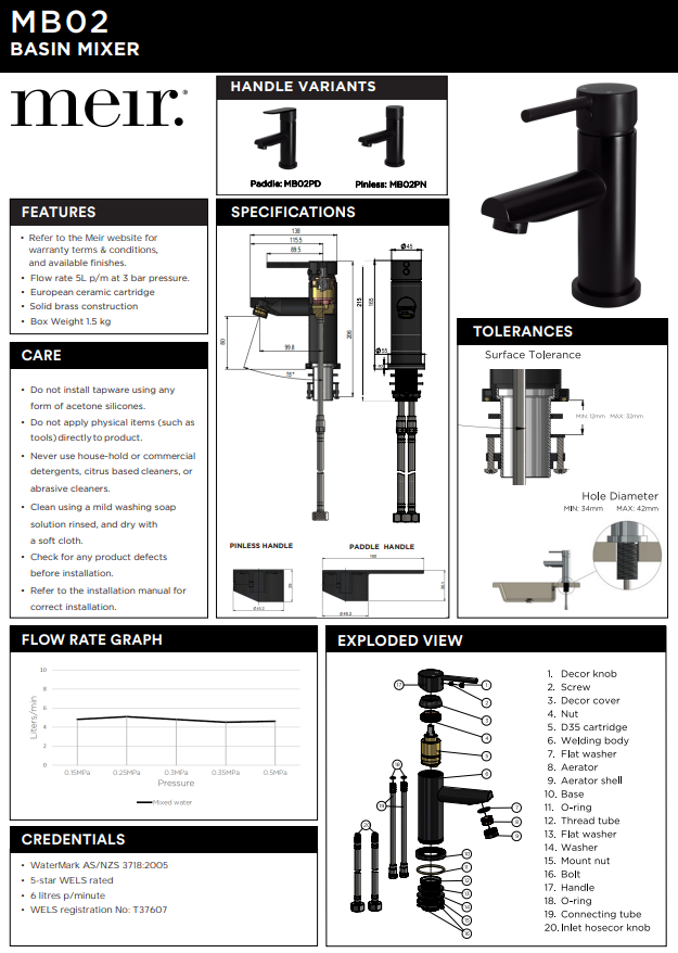 – 5-star WELS rating; water efficiency of 6 Litres per minute