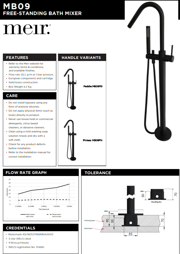 – 3-star WELS rating; water efficiency of 9 Litres per minute