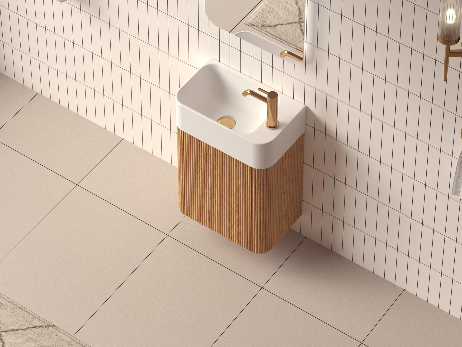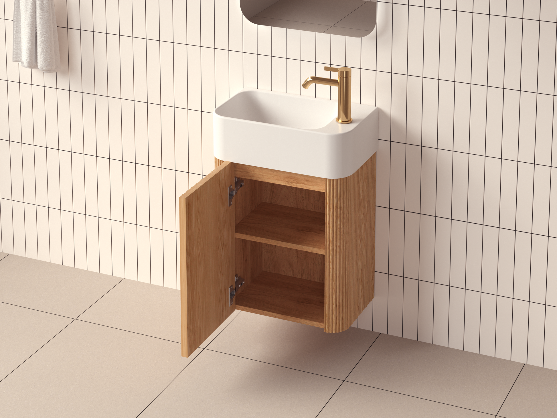 Bring a touch of modern minimalism to your bathroom with this elegant Mimi wall-hung vanity unit. Designed for compact spaces, it features a slim profile and clean lines, making it perfect for powder rooms or smaller bathrooms. The natural timber-look fluted finish adds warmth and texture, while the crisp white matte basin enhances the contemporary aesthetic.