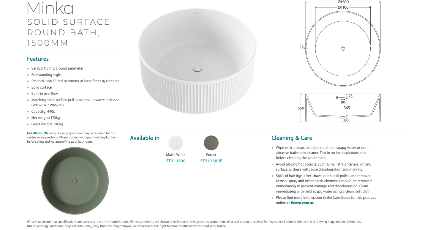 Minka Solid Surface Round Bath, 1500 mm, Forest