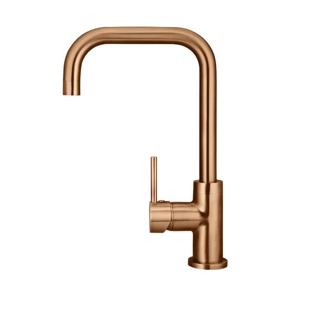 This lustre bronze kitchen mixer can be installed to have the handle either front-facing or on either side.