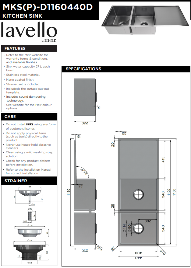 Lavello Kitchen Sink - Double Bowl & Drainboard 1160 x 440
