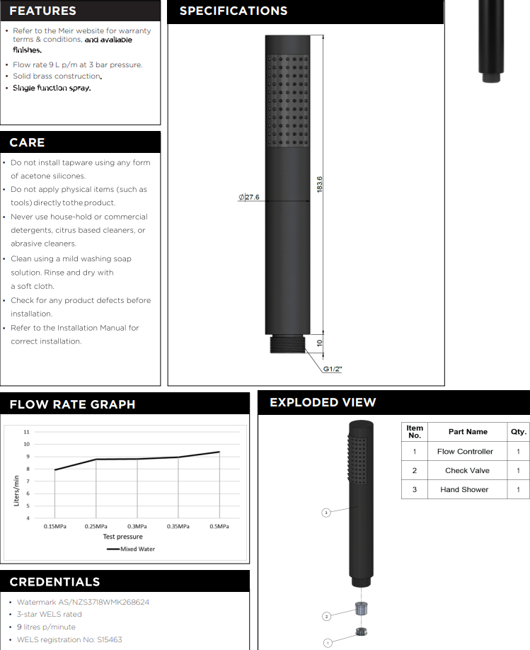 – 3-star WELS rating; water efficiency of 9 Litres per minute