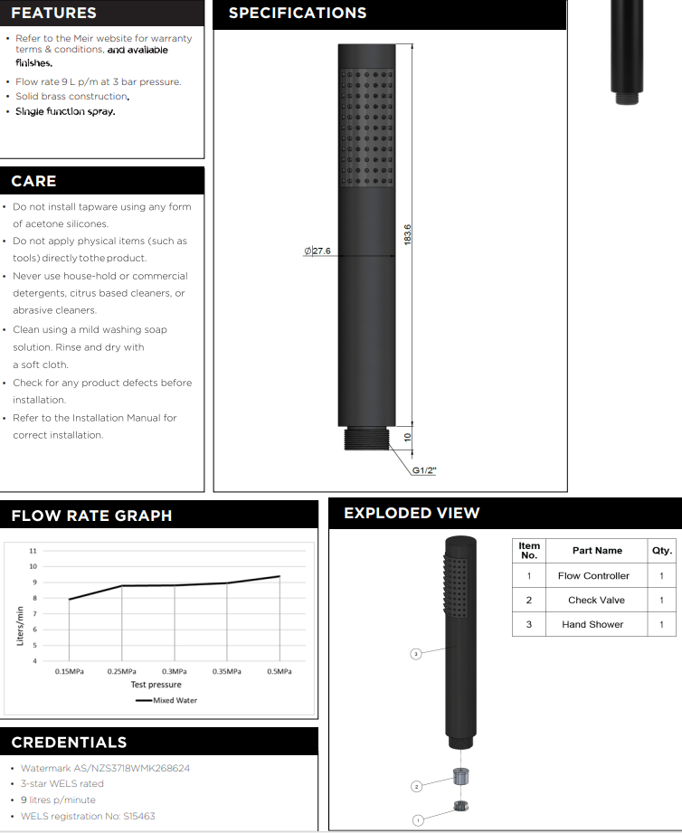 – 3-star WELS rating; water efficiency of 9 Litres per minute
