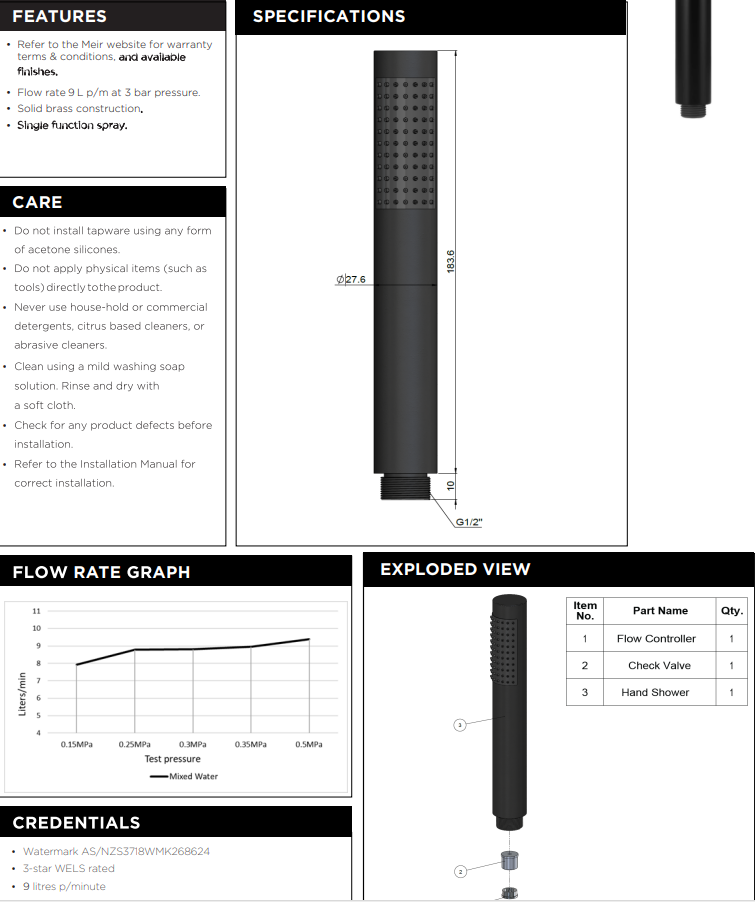 – 3-star WELS rating; water efficiency of 9 Litres per minute