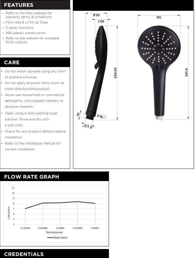 – 3-star WELS rating; water efficiency of 9 Litres per minute