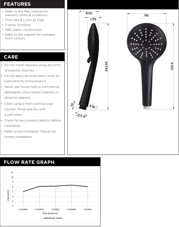 – 3-star WELS rating; water efficiency of 9 Litres per minute
