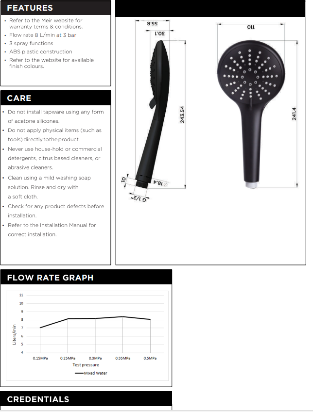 – 3-star WELS rating; water efficiency of 9 Litres per minute