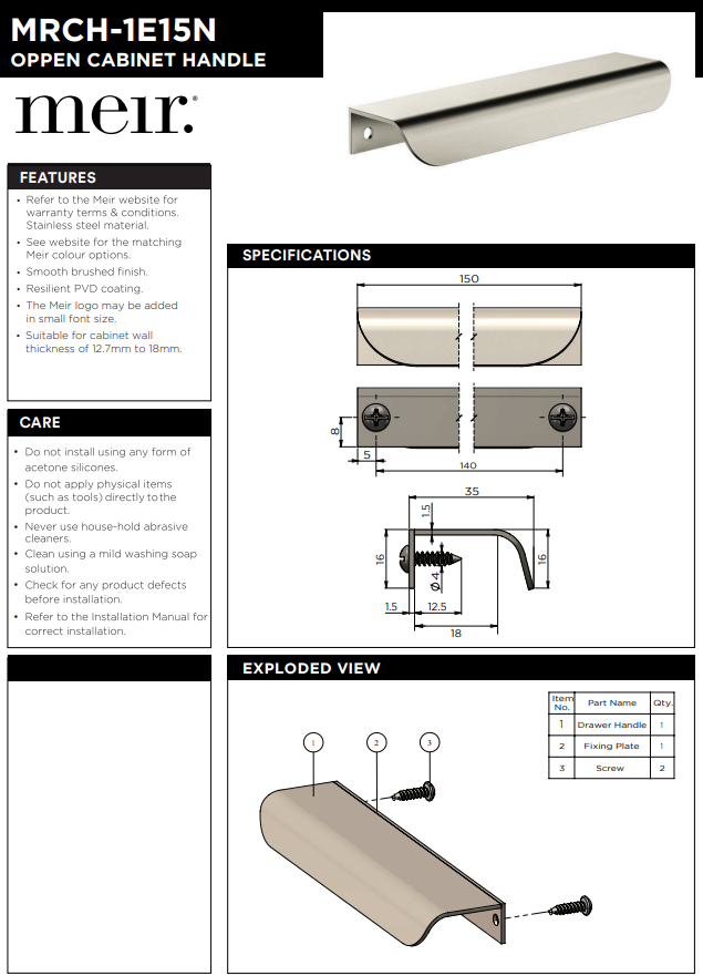 Meir Öppen Edge-Pull 150mm Cabinet Handle (Brushed) Brushed Nickel