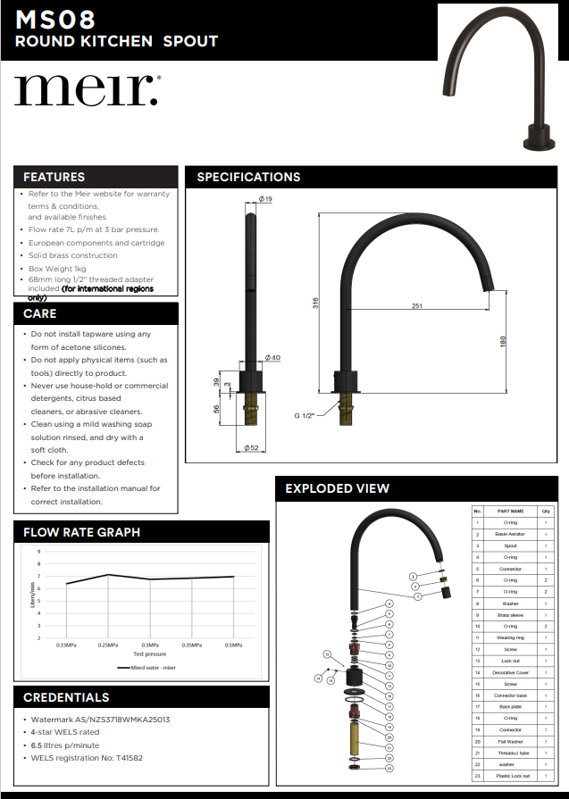 – 4-star WELS rating; water efficiency of 6.5 Litres per minute