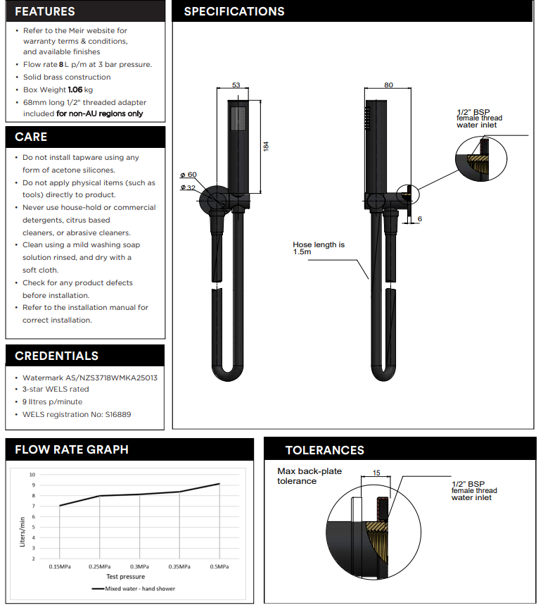 – 3-star WELS rating; water efficiency of 9 Litres per minute