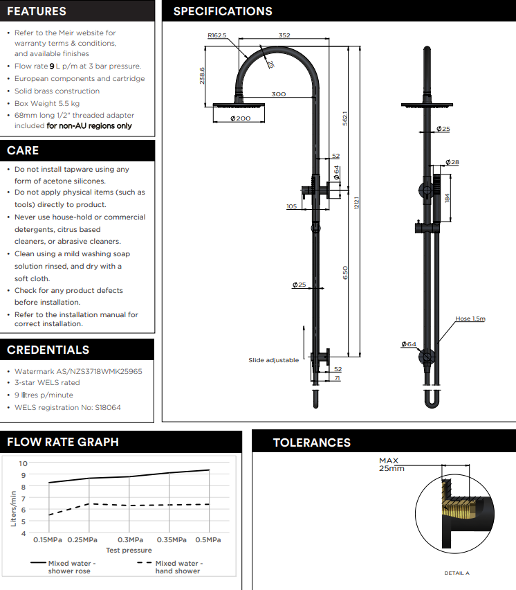 – 3-star WELS rating; water efficiency of 9 Litres per minute