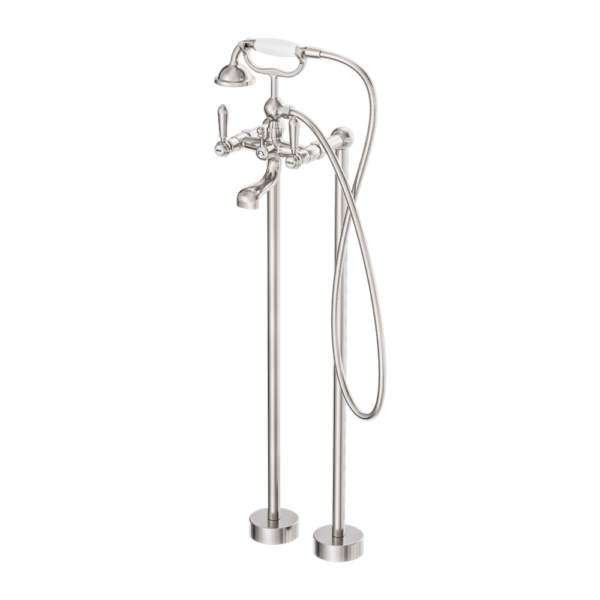 Nero York Freestanding Bath Set with White Porcelain Hand Shower - Brushed Nickel