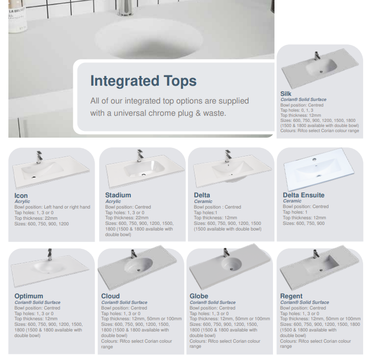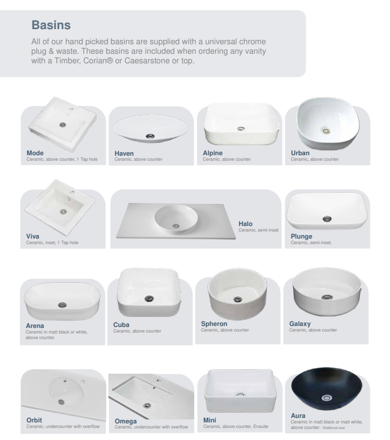 BASINS Mode, Cuba, Alpine, Urban, Arena, Galaxy, Spheron, Haven, Halo, Plunge, Viva, Omega, Orbit + Aura basin at an extra charge. Rifco basins come with a complimentary chrome plug waste.