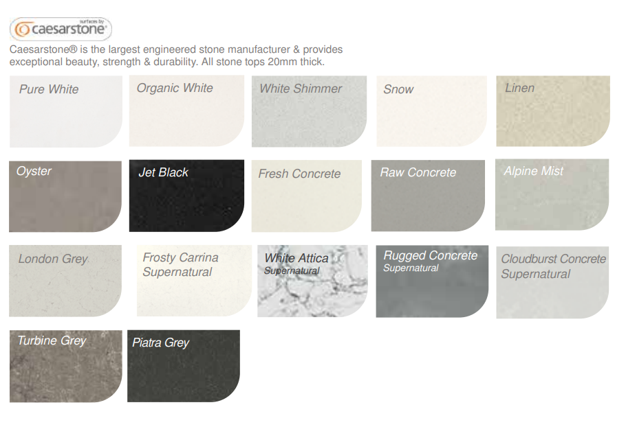 - 20mm Caesarstone (standard, deluxe colors or supernatural is at an extra charge)