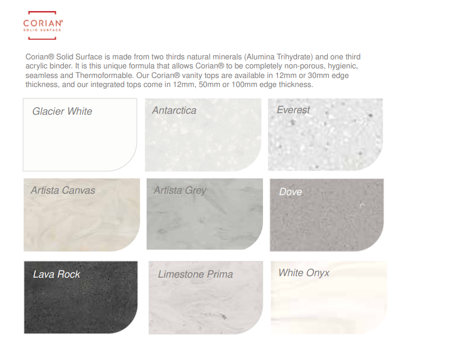 - 12-30mm Corian (standard glacier white others are at an extra charge)