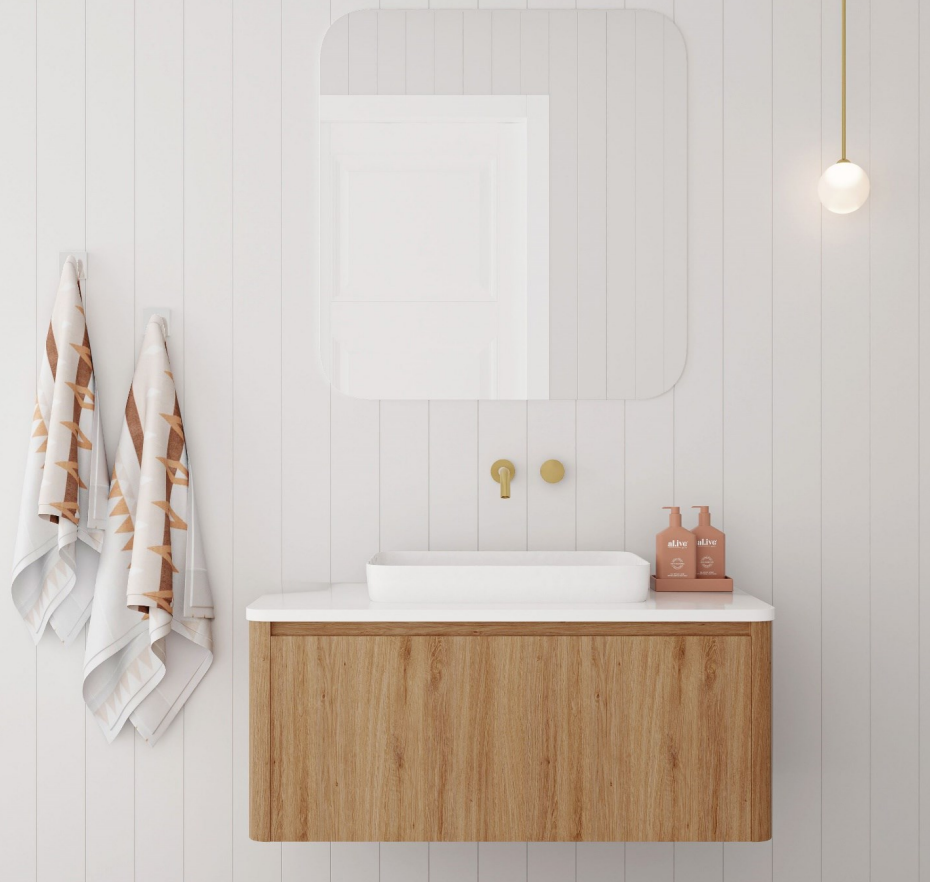 Pictured here as: 900w in solid timber Tasmanian Oak with 20mm Caesarstone® top in Pure White & Plunge basin. Also featuring Derwent mirror 750w